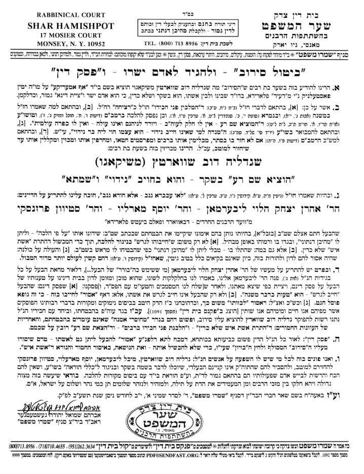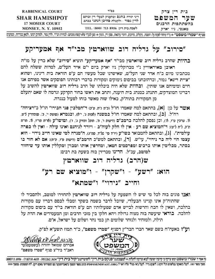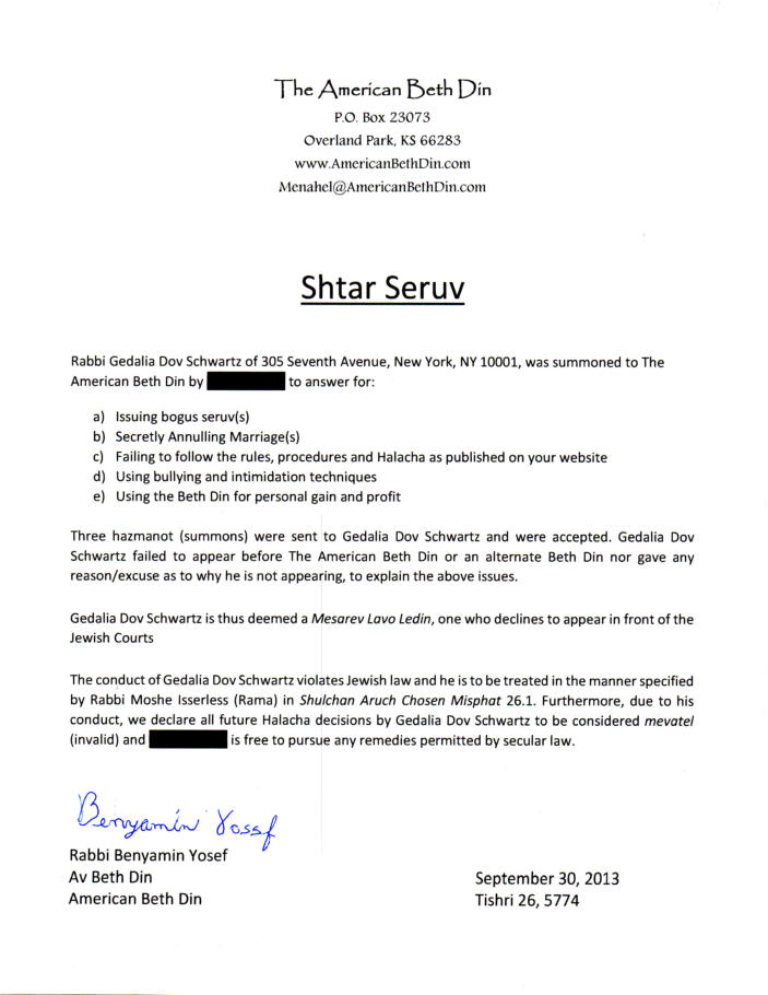 The following seruv against Rabbi Gedalia Dov Schwartz of the Beth Din of America